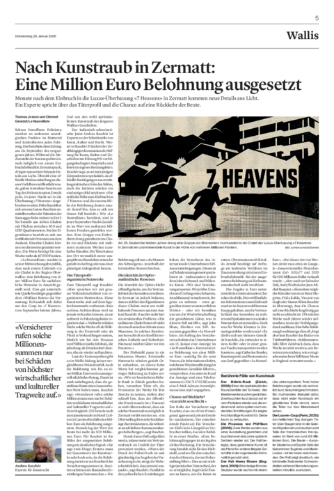 Die Identität der Opfer – strukturelle Probleme: Die Identität des Opfers bleibt offiziell geheim, um die Vertraulichkeit des Sammlers zu wahren. Raschèr sieht hier ein strukturelles Problem: «Ein exklusives Chalet bietet oft nicht den mechanischen Schutz eines Museums. In solchen Residenzen herrscht oft ein Konflikt zwischen Ästhetik und Sicherheit. Niemand möchte Gitter vor den Fenstern.» Der Diebstahl passe in ein bekanntes Muster. Kriminelle Netzwerke würden gezielt Orte aufsuchen, an denen hohe Werte bei vergleichsweise geringer Sicherung zu finden seien. «Wie wir bereits beim Bührle-Raub in Zürich gesehen haben, versuchen Täter oft, die Prominenz der Werke für ihre Zwecke zu nutzen, stellen aber schnell fest, dass der öffentliche Druck massiv ist.» Dazu sei es nicht überraschend, dass ein solcher Kunstraub womöglich in Zermatt verübt worden sei. «Im Oberwallis gibt es sehr hochklassige Zweitresidenzen, die teilweise unschätzbare Kunstsammlungen beherbergen», sagt Raschèr. Damit dieser Fall aufgeklärt werde, müsse meist ein Vertrauensbruch im Umfeld der Täter provoziert werden. «Wenn der Druck der Polizei hoch ist und gleichzeitig das Angebot der Versicherung lockt, steigt die Wahrscheinlichkeit, dass jemand auspackt», sagt Raschèr.